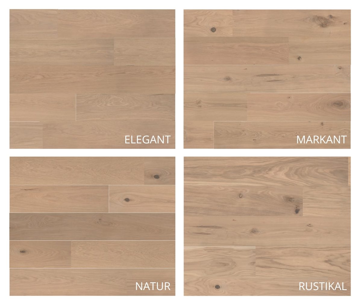 Unser Eichen-Parkett ist in vier Qualitätsstufen erhältlich. Je nach Ausprägung von Ästen, Splint und Farbunterschieden wirkt der Boden ruhig und elegant bis lebhaft und rustikal.