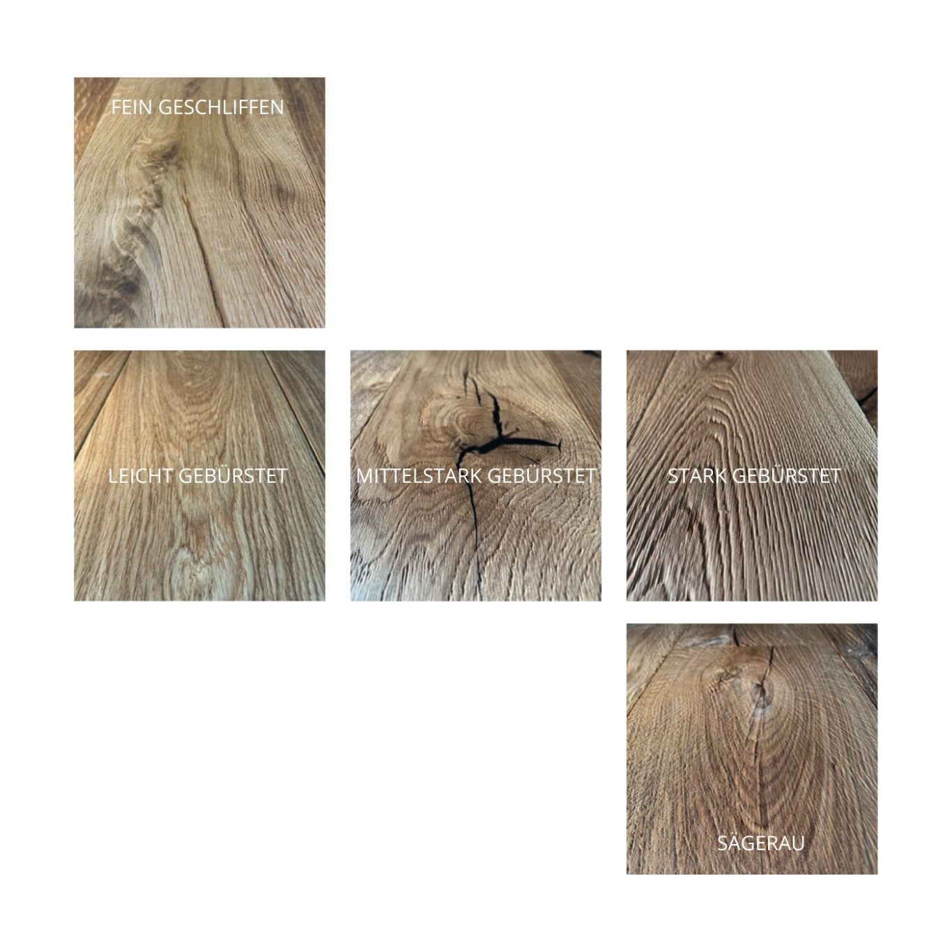 Fein geschliffen, gebürstet oder sägerau - wie soll Ihr neuer Boden aussehen? Welche Haptik soll Sie bei jedem Schritt begleiten? Fünf verschiedene Oberflächeneffekte stehen Ihnen zur Verfügung.